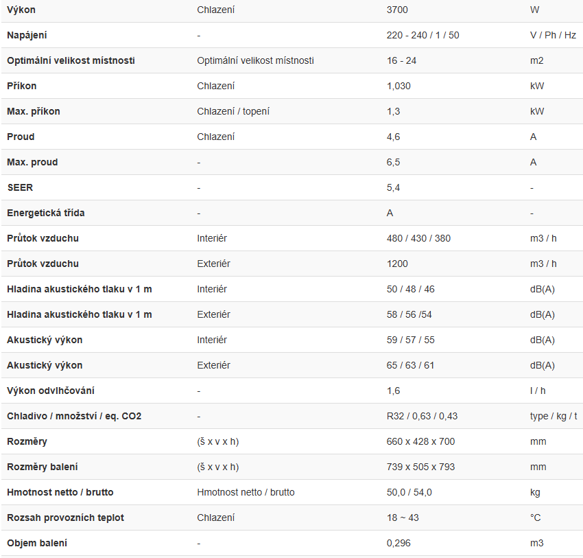 - Výkon chlazení 3,7kW