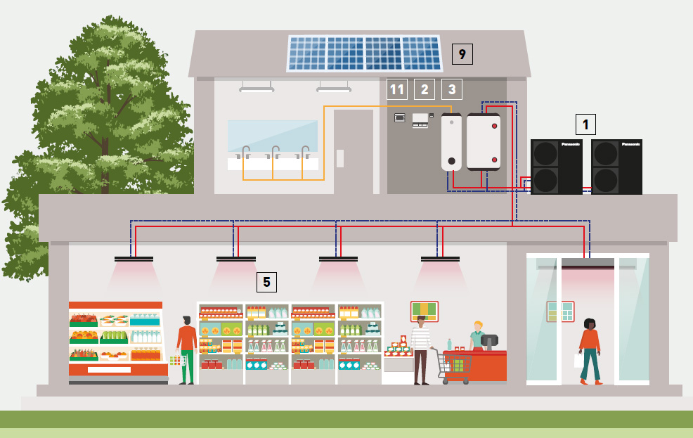 Nákres schématu instalace v komerčním objektu - např.prodejna a zázemí pro zaměstnance.